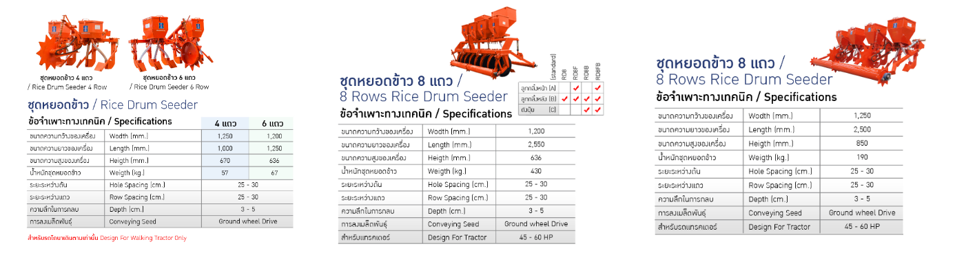 rice drum machine It is a machine used for growing rice in dry fields or rainy fields suitable for areas. that is far from the source of water for rice cultivation Rice grown from a rice seeder will look like rice from planting in the black field There are rows and spacing between clumps that are tidy, easy to take care of, fertilize and weed control. Yields better than sown rice The machine can also be used to sow grains. Our rice seeders are both attached to the walking tractor and attached to the tractor.