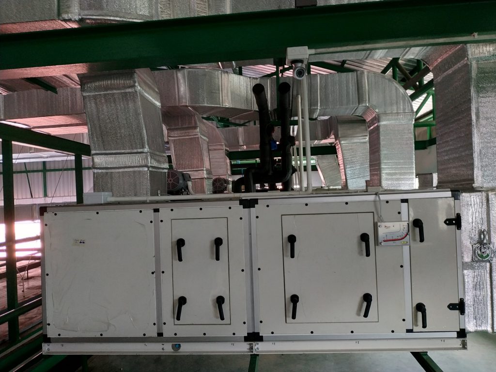 AIR HANDLING UNIT (AHU) is a system or machine that primarily functions to circulate and improve the quality of air within buildings or specific areas. The AHU filters the air, adjusts the temperature, humidity, and distributes the air to the desired locations through ductwork. This system is commonly used in large buildings such as hospitals, industrial plants, and offices.