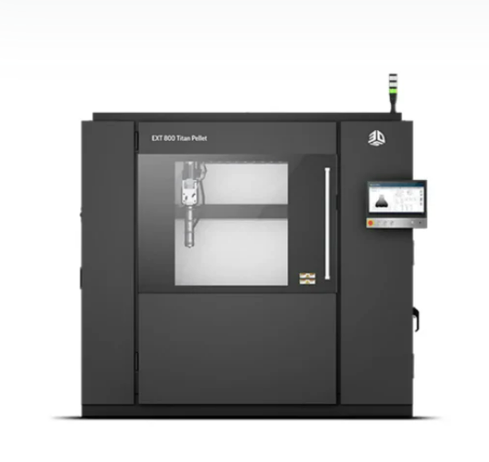 The "EXT 800" from 3D Systems is an industrial 3D printer utilizing pellet-based materials, offering high efficiency and speed while achieving cost savings and productivity gains.