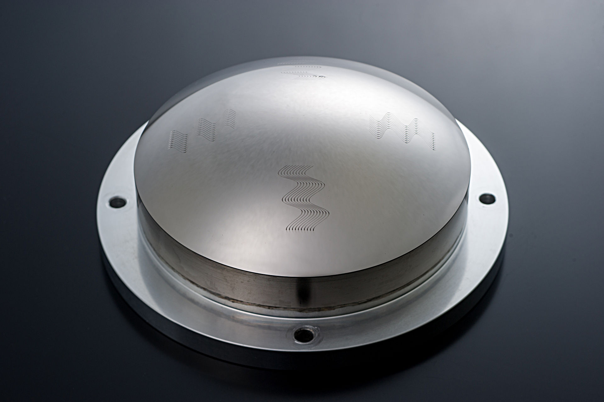 This is an example of simultaneous 6-axis grooving using a single-point diamond tool on a free-curved surface (non-symmetrical aspherical shape). High-precision grooving is possible not only on flat surfaces but also on free-curved surfaces.